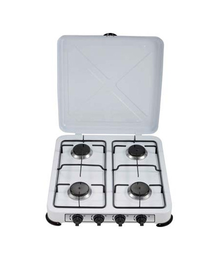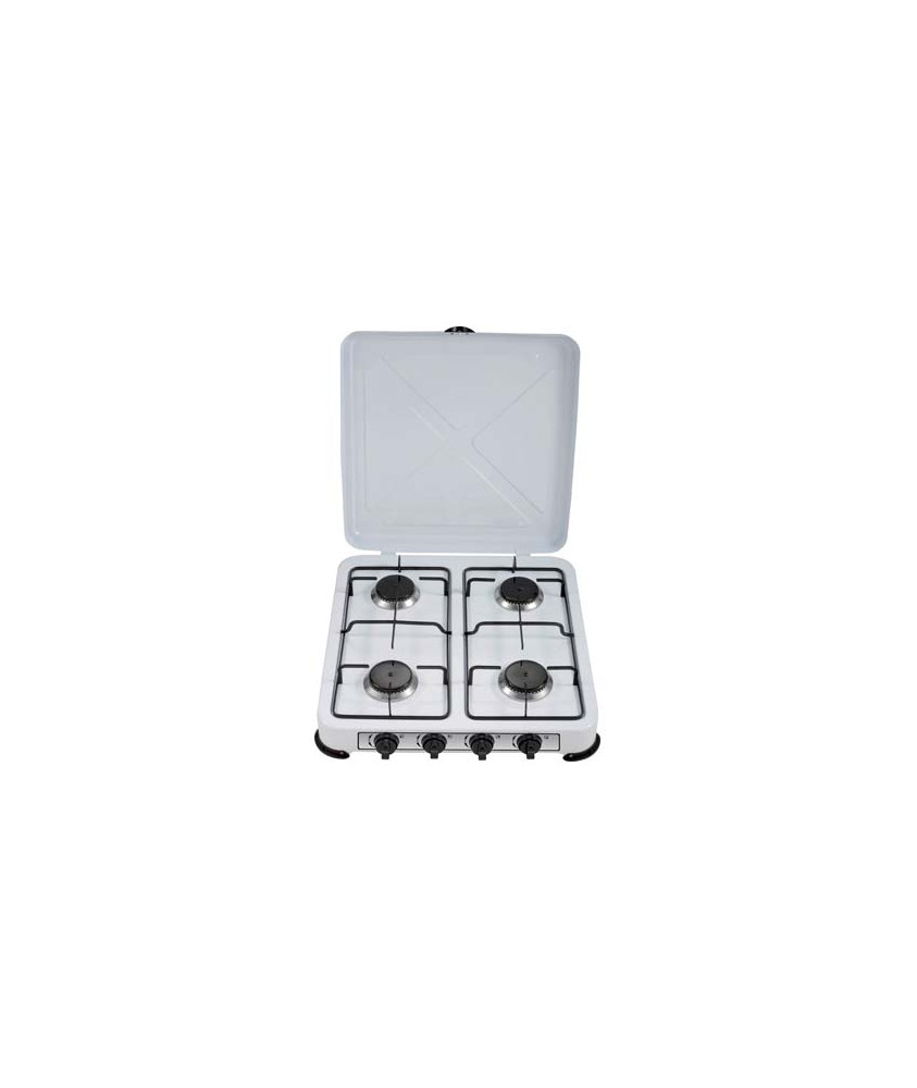 Con 4 fuochi, coperchio e griglie in acciaio. Struttura in acciaio con verniciatura elettrostatica bianca. Dimensioni: Cm. 51,2x50,5, altezza Cm. 8,7.