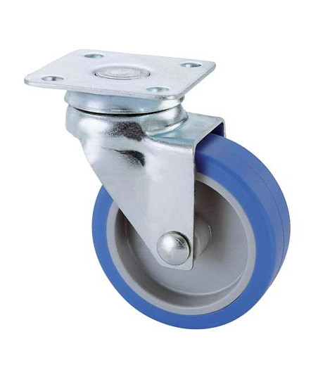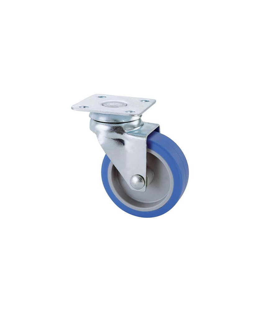 Supporto in acciaio stampato rotante su doppia corona di sfere. Finitura zincocromata. Ruota in gomma sintetica flangiata in termoplastico.