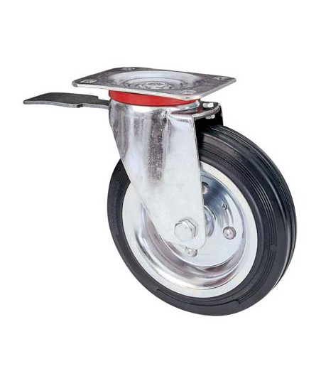 RUOTA A FORCELLA GIREVOLE + FERMO 80BIS AVO • A/ZINCR/GOMMA NERA D.MM 200X50 P.MM 140X110
