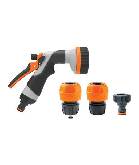 Con 8 getti selezionabili, regolatore di flusso, impugnatura ergonomica ed attacco quick. Completa di presa a rubinetto da 3/4", raccordo portagomma aperto e aquastop. Per tubi da 1/2" a 5/8"