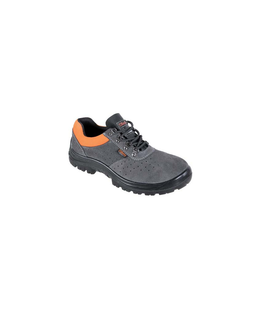 Tomaia in pelle scamosciata traforata. Classe di protezione S1P: puntale in acciaio resistente ai 200J, suola antiscivolo (SRC) in poliuretano compat...